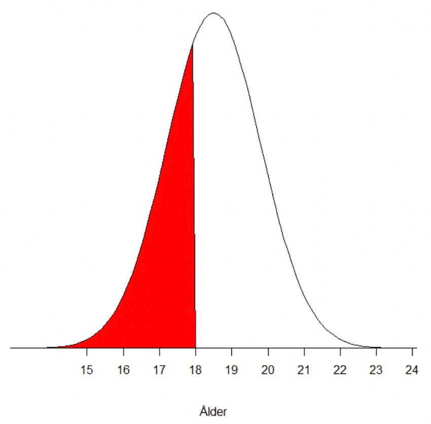 Figur 2 illustrerar åldersfördelningen för när knät mognar hos pojkar/män, utifrån beräkningar baserade på Socialstyrelsens studie [5, 6]. Arean till vänster om 18 år är betydligt större än i figur 1 – det vill säga betydligt fler mognar i knät före 18 års ålder än vad Socialstyrelsen och RMV trodde från början. Det här är grundläggande statistik och en kunskap som omöjligt kan saknas hos de experter som skrivit under svaren till Justitiedepartementet.