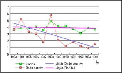 Sin vana trogen förenklar Göran Isacsson sitt resonemang och låter datakalkylprogrammet dra slutsatser i stället för att själv tolka statistiska uppgifter i ett bredare sammanhang. Effekterna av det självmordspreventiva programmet i Dade county utvärderades genom att utfallet före och under interventionen jämfördes med resultat från övriga Florida och hela USA (Figur 1;Tabell I). Självmordstalet bland unga i Dade county i Florida sjönk med 61 procent under interventionen, jämfört med en observerad 5-procentig minskning under samma period i hela Florida och en 4-procentig ökning i hela USA.