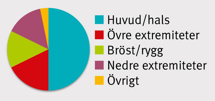 Figur 1. De vanligaste förekommande skadeområdena vid misshandel av äldre, enligt den journalgranskning som gjorts vid Helsingborgs lasaretts akutmottagning. (Grafik LT, efter original)