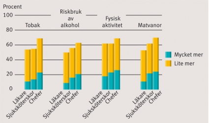 Cirka 90 procent av cheferna, oavsett om de har underställda chefer eller inte, anser att det är viktigt med rådgivning kring alla levnadsvanor i den egna verksamheten. Chefer och professioner är eniga om att hälso- och sjukvården borde arbeta mer än i dag med sjukdomsförebyggande rådgivning.