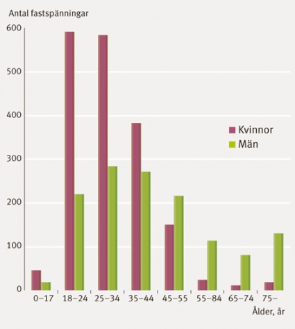 Det vi kan se i den registrering som skett under 2010 är att vid bältesläggning dominerar de yngre kvinnorna stort. Denna grupp domineras också av just diagnosen personlighetsstörning. Statistiken är som vi bedömer det ofullständig, men om den är proportionell så gäller var tredje bältesläggning inom svensk psykiatri i dag en kvinna i åldern 18–34 år.