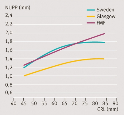 Enheter som erbjuder CUB bör kontinuerligt kvalitetssäkra sina data avseende ultraljud och biokemi. Olika matematiska algoritmer har utvecklats för riskbedömning. De bygger generellt på två olika principer. I algoritmer som baseras på enbart empiriska material uppnås god överenskommelse med det ursprungliga materialet och populationen. Emellertid kan många faktorer ändras över tid. Vidare finns det säkerligen populationsskillnader som är betydelsefulla för riskbedömningen. En sådan variabel är NUPP-måttet (Figur 2). Av figuren framgår relativt stora skillnader mellan de studerade populationerna.