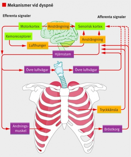 Andnöd är ett komplext symtom. Andningen regleras normalt genom en interaktion av signaler från centrala nervsystemet, kemoreceptorer i hjärnstammen (för pCO2 och pO2) och receptorer i luftvägar och bröstkorgsmuskler [1]. Andningen kan även styras genom viljan. Flera olika mekanismer kan bidra till dyspné, men det finns inga dyspnéreceptorer eller specifika områden i hjärnan som direkt kan stimuleras och ge andnöd.