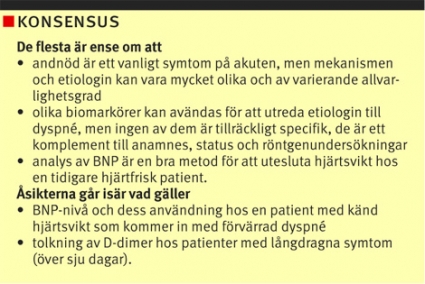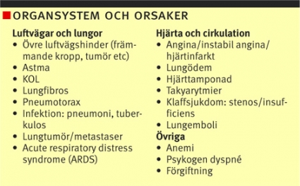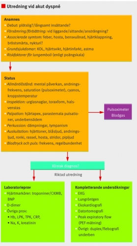 Orsakerna till akut dyspné, andnöd, är många. Den här artikeln försöker presentera en utredningsalgoritm för att snabbt diagnostisera allvarliga orsaker till dyspné. Styrkan och svagheterna i olika undersökningsmetoder och deras tillförlitlighet tas upp medan behandlingsstrategier inte berörs. Fokus är akut uppkommen dyspné, varför tonvikten ligger på kardiella och pulmonella etiologier.