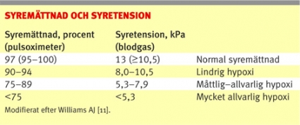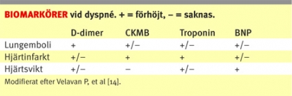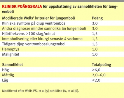 KOL och lungemboli. Kardinalsymtom vid akut försämring av KOL är, förutom tilltagande dyspné, purulent och ökad mängd sputum [4]. Andra symtom som oftare förekommer är samtidig övre luftvägsinfektion, feber, ökad hosta samt förhöjd hjärt- och andningsfrekvens. Vid misstanke om lungemboli finns skalor där anamnesen tillsammans med de kliniska fynden ger en uppskattning av sannolikheten för sjukdomen [5, 6]. Riskfaktorer som kirurgi/ortopediska ingrepp, trauma, p-piller, immobilisering och tidigare tromboembolism stödjer diagnosen.
