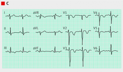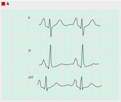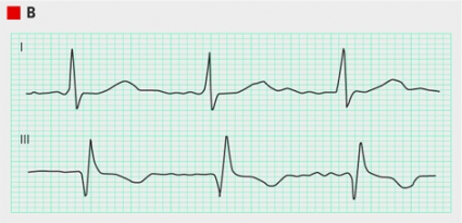 På EKG diagnostiseras ischemiförändringar och arytmier. Vid hjärtsvikt är ett normalt EKG ovanligt och minskar sannolikheten för diagnosen, även om fynden är ospecifika [13]. Sinustakykardi och förmaksflimmer är vanligare, likaså T-vågsavvikelser och tecken på vänsterkammarhypertrofi. QRS-komplexen är ofta breddökade hos patienter med hjärtsvikt. Av de hjärtsviktspatienter som har vänstersidigt skänkelblock på EKG har omkring hälften markerat nedsatt systolisk vänsterkammarfunktion [14]. Vid lungemboli ses tex sinustakykardi och tecken på högerkammarbelastning [15-17]. Vid KOL kan man finna P-pulmonale och högerkammarbelastning.