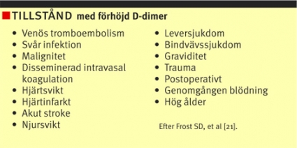 D-dimer är en degradationsprodukt av korsbundet fibrin. D-dimer är förhöjt vid många tillstånd där tromber bildas och omsätts och är därför inte specifikt för lungemboli eller djup ventrombos. D-dimer kan normaliseras vid kronisk lungembolism. Hos patienter med anamnestiskt låg sannolikhet för lungemboli har D-dimer ett negativt prediktivt värde på 97–100 procent [5, 6, 21].