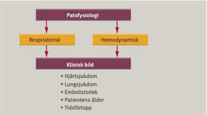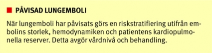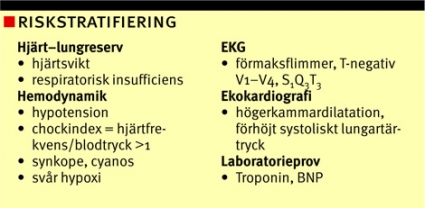 Misstänkt lungemboli vid instabil hemodynamik. På samma sätt som vid trauma, hjärtinfarkt och stroke finns en »golden hour« för lungembolipatienter med instabil hemodynamik. Vid riskstratifiering av dessa patienter bör aktuell hjärt–lungreserv tas i beaktande, vilket har betydelse för tempot i den diagnostiska utredningen liksom i valet av behandlingsstrategi. Instabil hemodynamik innebär högerkammarpåverkan med systemisk hypotension (oftast 90–100 mm Hg), takykardi, hypoxi och ofta svår dyspné med eller utan bröstsmärta.