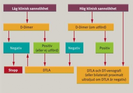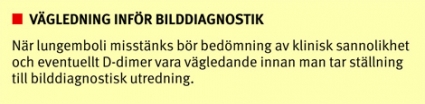 Kombinationen låg klinisk sannolikhet och negativ D-dimer utesluter med hög sannolikhet (95–99 procent) lungemboli, åtminstone bland polikliniska patienter med en symtomduration kortare än 1–2 veckor [11-13]. I en nyligen publicerad studie av misstänkta lungembolier kunde man säkert utesluta lungemboli hos patienter med låg klinisk sannolikhet och negativ D-dimer [8, 14, 15]. Sensitiviteten är lägre för icke-automatiserade latexmetoder än den är för ELISA-teknik eller automatiserade kvantitativa latexmetoder. D-dimer har knappast något värde vid hög klinisk misstanke eller hos hemodynamiskt instabil patient. Dessa patienter bör genomgå bilddiagnostiska metoder oavsett vad D-dimer visar. Förhöjd D-dimer kan förekomma även vid flera andra sjukdomstillstånd, tex infektioner, cancer, olika inflammatoriska sjukdomar, graviditet eller vid blödning.