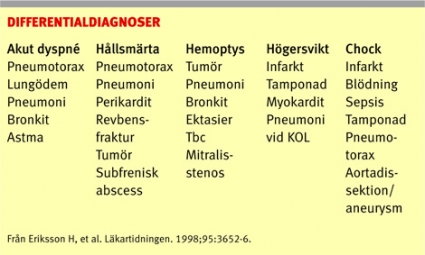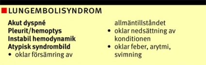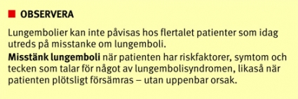 Lungemboli utgör fortfarande en inte ovanlig orsak till plötslig död och anses vara en av de sju »dödssynderna« vid en internmedicinsk akutmottagning [1]. Förekomsten av lungemboli i befolkningen uppskattas till en total årlig incidens av ca 0,5– 1/1000 men ökar till 1/100 i åldern 70 år och äldre [2]. Embolikällan utgörs oftast av en djup ventrombos i en nedre extremitet, men även tromboser i arm eller hjärta kan utgöra ursprunget till embolierna. De flesta orsaker kan hänföras till en eller flera komponenter i Virchows triad (kärlskada, venstas och hyperkoagulation).