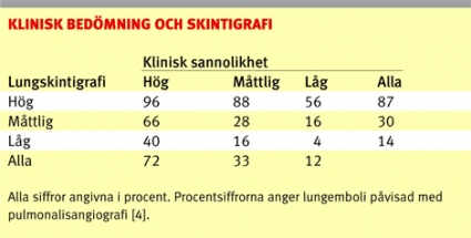 I den första PIOPED-studien såg man att en hög skintigrafisk sannolikhet innebar förekomst av lungemboli i 87 procent av fallen när man använde pulmonalisangiografi som referensmetod [4]. Tillsammans med en hög klinisk sannolikhet däremot förelåg lungemboli i 96 procent av fallen, vilket är indikation för behandling. I samma studie fann man även att vid enbart låg skintigrafisk sannolikhet förelåg lungemboi i 14 procent av fallen, medan man vid samtidig låg klinisk sannolikhet fann lungemboli i 4 procent av fallen. Dessa 4 procent kan jämföras med att man vid negativ flebografi eller negativ pulmonalisangiografi finner lungemboli i ca 1–2 procent av fallen vid tre månaders uppföljning [5].