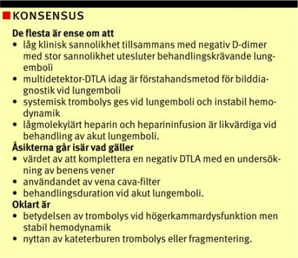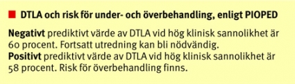 Vid hög klinisk sannolikhet och positiv DTLA var däremot det positiva prediktiva värdet 96 procent. Ett intressant fynd i PIOPED II-studien var att vid låg klinisk sannolikhet hade endast 58 procent lungemboli vid positiv DTLA, vilket kan indikera risk för överbehandling [19]. Observeras bör att i PIOPED II-studien fick av etiska skäl endast de patienter som vid andra undersökningar hade inkonklusiva resultat genomgå digital subtraktionsangiografi. Värdet av studien kan därför till viss del ifrågasättas.
