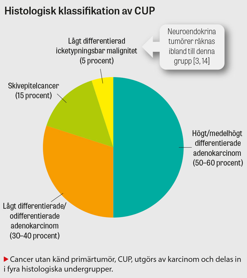 I Sverige insjuknar drygt 61 000 patienter i cancer varje år, och 20 procent av fallen debuterar med metastaserad sjukdom. Första steget i en malignitetsutredning vid metastaserad cancersjukdom består vanligen av att identifiera primärtumören, då den ger viktig information om cancerform, behandling och prognos. Hos 1–2 procent av patienterna kan dock primärtumören inte hittas, varpå de får diagnosen »cancer utan känd primärtumör« (CUP) [1]. CUP är en heterogen sjukdomsgrupp med en eller flera morfologiskt bekräftade metastasmisstänkta förändringar där varken kliniska symtom eller fynd tyder på en organspecifik cancertyp. Tumörerna tillhör gruppen epiteliala karcinom. Traditionellt exkluderas melanom, sarkom och lymfom från diagnosen. Vid CUP förblir primärtumören okänd trots genomförd utredning.