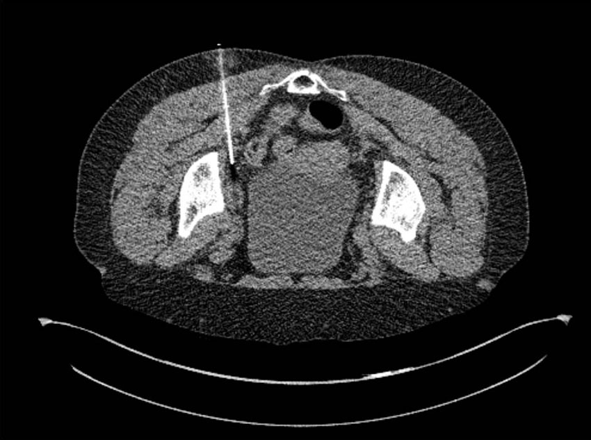 Datortomografiledd punktion i bukläge av patologiskt förstorad vänstersidig lymfknuta i lilla bäckenet. Lymfknutan visade högt upptag av fluorodeoxiglukos (FDG, se nedan) vid den PET-DT-undersökning som visas i figuren nedan.
