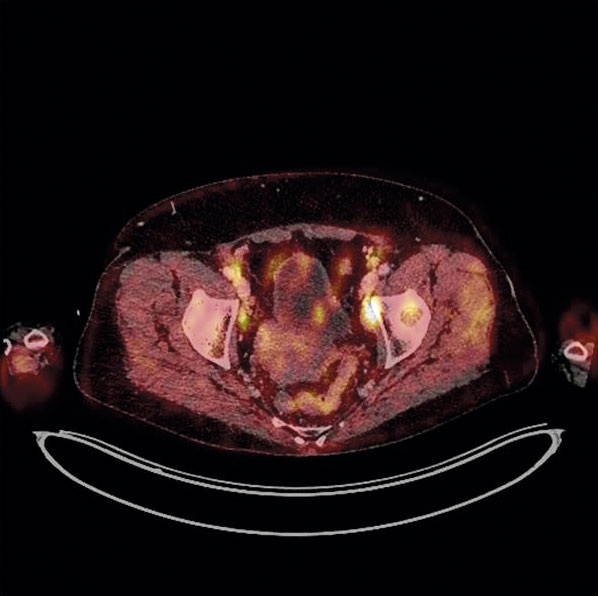 PET-DT med FDG. Vid PET-DT med FDG används den positronemitterande isotopen 18-fluorodeoxiglukos. Isotopen är en radioaktiv glukosanalog med en halveringstid på 110 min och tas upp av vävnad med hög glukosmetabolism, som tumörvävnad. Metoden kan inte säkert skilja mellan inflammation och malignitet utan speglar grad av glukosmetabolism i förändringen. Fynd med högt FDG-upptag (PET-positiva) ska därför verifieras cytologiskt eller histopatologiskt [22]. Bilden visar fokala patologiska höga FDG-upptag i iliakala lymfkörtlar med stark malignitetsmisstanke.