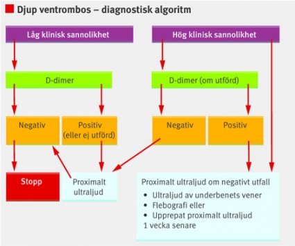 Vid förhöjd D-dimer bör ytterligare utredning göras med antingen flebografi eller ultraljud av hela benet. Kan DVT ändå inte uteslutas, tex vid proximalt ultraljud eller ofullständig flebografi, bör ett nytt proximalt ultraljud utföras efter en vecka.