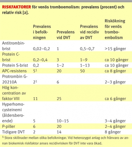 Efter insjuknande i venös trombos är risken för en ny episod efter avslutad anti-vitamin K-behandling ca 4–7 procent per år under de första åren. Män löper upp till 3–4 gånger större risk för återinsjuknande än kvinnor [11]. Trots adekvat behandling drabbas ca 4 procent av ny venös tromboembolism under pågående behandling [9]. Anti-vitamin K-behandlingen medför ökad risk för blödningar. Den årliga risken för allvarlig blödning är ca 2–3 procent. Möjligen är risken för blödning som störst de första månaderna efter insatt behandling [12].
