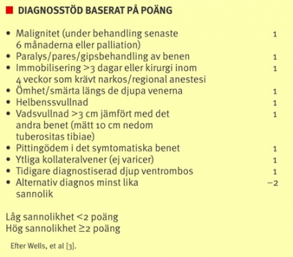 Utifrån anamnes och status kan man sedan med ett poängbaserat system göra en sannolikhetsbedömning. Detta bör ligga till grund för val av fortsatt utredningsstrategi [3]. Ett poängbaserat diagnosstöd täcker inte in alla tänkbara situationer utan måste kompletteras med eftertanke och klinisk erfarenhet. Hänsyn bör tas till faktorer som p-piller, graviditet, känd trombofili och familjär förekomst av ventrombos. I en nyligen publicerad metaanalys sammanfattas att Wells poängbaserade diagnosstöd har fördelar jämfört med empirisk bedömning: det är standardiserat, reproducerbart, bättre validerat och bättre för proximal än för distal trombos, särskilt på yngre personer utan tidigare ventrombos [4].