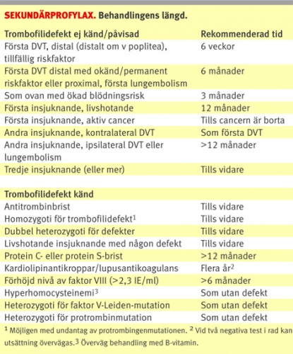 Lägre startdos rekommenderas vid ökad blödningsrisk. Blödningsrisken vägs också in vid val av behandlingstidens längd. Hur länge sekundärprofylaxen bör fortgå varierar kraftigt: från sex veckor till livslångt. Vid beslut om behandlingstidens längd är det viktigt att ta hänsyn till patientens egen inställning. Anti-vitamin K-behandling kan avslutas tvärt.