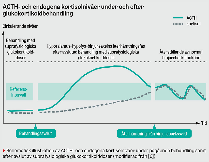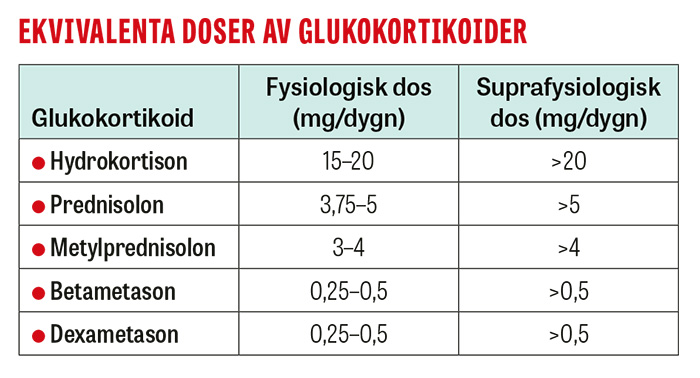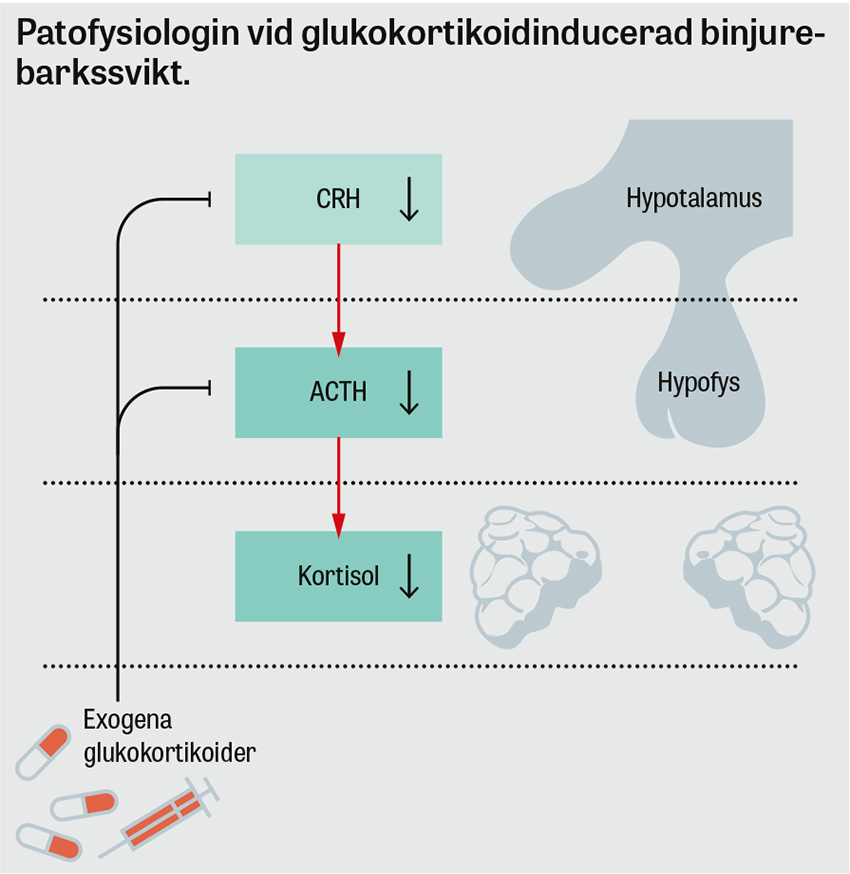 Glukokortikoider används i inflammationsdämpande syfte vid ett flertal sjukdomar och tillstånd inom en mängd olika specialiteter [1]. I Sverige används främst de perorala glukokortikoiderna prednisolon och betametason, men även hydrokortison, dexametason och metylprednisolon förekommer. Behandling med glukokortikoider medför en ökad risk för övergående eller bestående glukokortikoidinducerad binjurebarkssvikt, även kallad iatrogen eller tertiär binjurebarkssvikt [2].