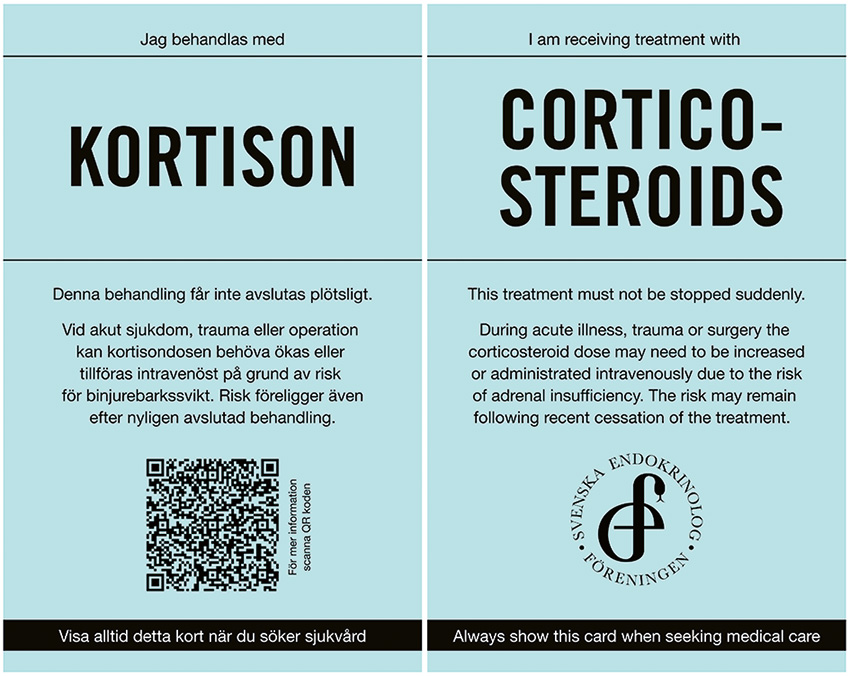 Sedan 2010 finns ett svenskt nationellt medicinskt varningskort för patienter med permanent primär och sekundär binjurebarkssvikt [23]. Då patienter med glukokortikoidbehandling löper risk att utveckla binjurebarkssvikt, vilken oftast är övergående, passar det befintliga kortet inte denna patientkategori. I Storbritannien finns sedan många år ett blått »steroid treatment card« för just detta ändamål [24].
