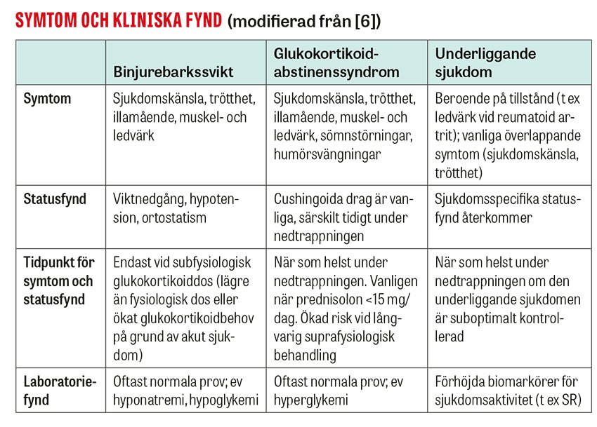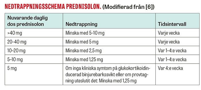 Risken för glukokortikoidinducerad binjurebarkssvikt bör finnas i åtanke för alla patienter som behandlats med glukokortikoid i doser motsvarande prednisolon >5 mg i mer än 3–4 veckor då dosen har trappats ned till fysiologisk dos (prednisolon 3,75–5 mg eller motsvarande) och fortsatt nedtrappning är planerad [6].