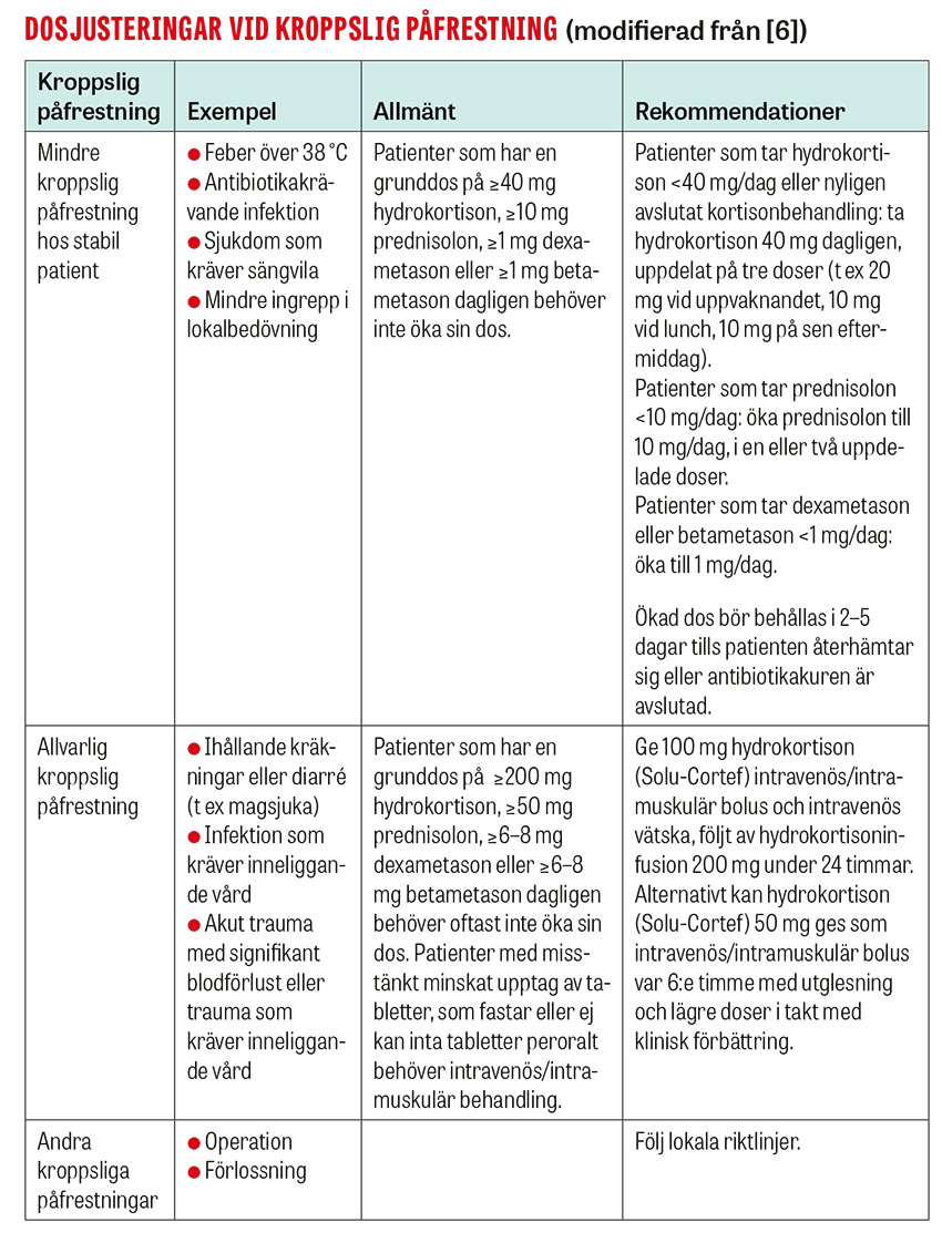 Vid sjukdom har kroppen behov av högre kortisolnivåer över hela dygnet. Vid feber >38 °C, sjukdom som kräver sängvila, infektion som kräver antibiotikabehandling eller mindre ingrepp i lokalbedövning ska därför patienter tillfälligt öka sin glukokortikoiddos. Det enklaste förfarandet är att öka prednisolon till 10 mg dagligen, uppdelat på 1 eller 2 doser, alternativt hydrokortison 20 + 10 + 10 mg, under sjukdomsperioden. När patienten är frisk återgår man till den ursprungliga dosen. Patienter med grunddos >10 mg prednisolon behöver inte öka sin dos.