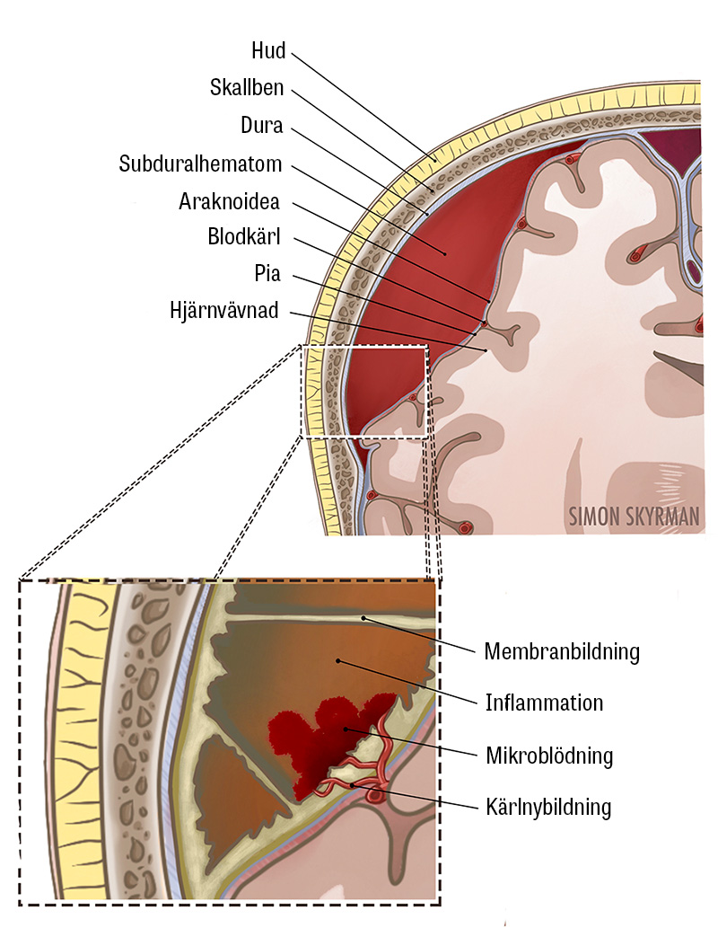 Schematisk bild av ett kroniskt subduralhematom i förhållande till omkringliggande anatomiska strukturer, samt översiktlig patofysiologi över tid. Illustration: Simon Skyrman