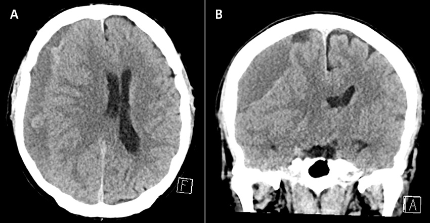 Datortomografi av hjärna som visar ett högersidigt kroniskt subduralhematom i axial (A) och koronar (B) projektion.