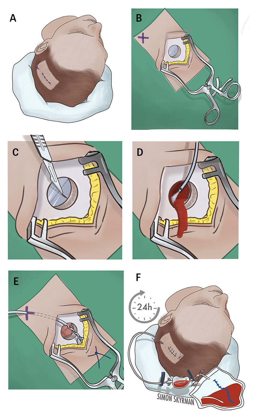 D) Utrymning av blödningen samt sköljning med vätska. E) Subgalealt drän (Exudrain) appliceras och tunneleras. F) Dränet avlägsnas efter timmar till dygn, och patienten kan sedan mobiliseras.