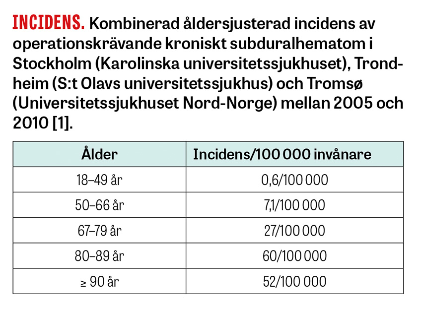Ett kroniskt subduralhematom är en ansamling av äldre blod och vätska mellan den hårda hjärnhinnan (duran) och spindelvävshinnan (araknoidean). Det är ett av de vanligaste tillstånden som kräver neurokirurgi, med en incidens på upp till 60 per 100 000 invånare i Skandinavien [1]. Antalet patienter förväntas stiga ytterligare i takt med den åldrande befolkningen och den ökade förskrivningen av blodförtunnande läkemedel [2, 3]. I och med detta kommer behovet av kunskap kring diagnosen att öka hos samtliga sjukvårdsinstanser. I denna ABC-artikel går vi igenom patofysiologi, diagnostik och handläggning av kroniskt subduralhematom.