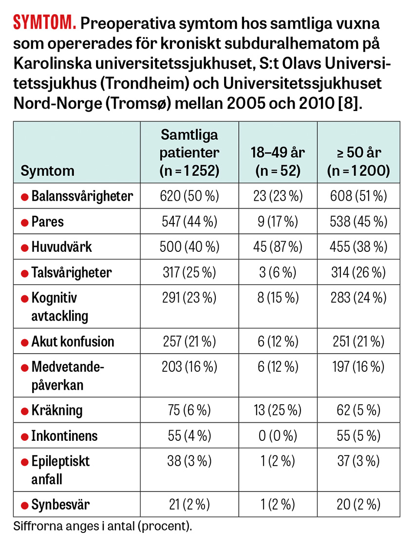 Eftersom ett kroniskt subduralhematom expanderar med lågt tryck under längre tid (veckor till månader), kan det uppnå relativt stor volym innan symtom uppstår. Det är dock viktigt att veta att fall av snabb försämring relaterad till inklämning förekommer även då skadan är »gammal«, framför allt vid bilateralt kroniskt subduralhematom [5] samt hos yngre, som har större hjärnvolym och oftare söker med enbart huvudvärksbesvär [8].