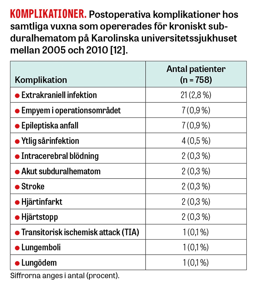 Komplikationer och prognos. I en genomgång av opererationerna som utförts i Stockholm var de vanligaste postoperativa komplikationerna extrakraniella infektioner (2,8 procent), intrakraniella empyem (0,9 procent) och epileptiska anfall (0,9 procent). Potentiellt livshotande komplikationer sågs hos cirka 3 procent, vilka bland annat innefattade ischemisk stroke och hjärnblödningar, men även extrakraniella händelser såsom hjärtinfarkt, sepsis och hjärtstopp [12].
