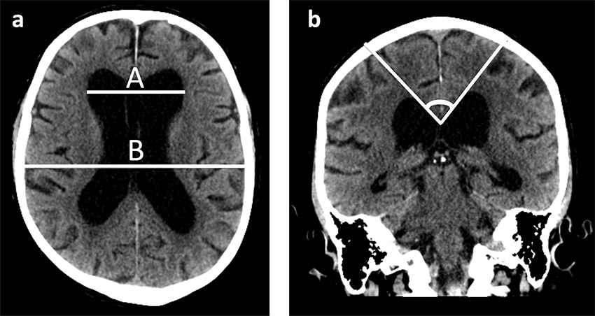 DT-bilder av hjärnan hos en patient med idiopatisk normaltryckshydrocefalus i (a) axialplanet och (b) koronalplanet. Bild (a) illustrerar Evans-index, där kvoten A/B hos patienter med hydrocefalus ska vara > 0,3. Bild b) visar en corpus callosum-vinkel < 90 grader, vilket tyder på idiopatisk normaltryckshydrocefalus.