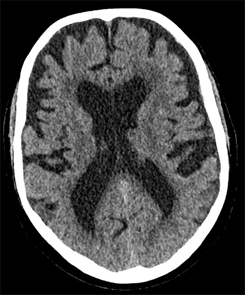 DT-bild som visar generell hjärnatrofi där ventriklarna vidgats på grund av nedbrytning av parenkym.