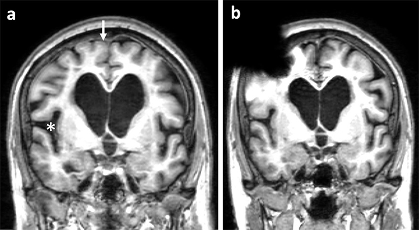 MR med FLAIR-sekvenser preoperativt (a) och 3 månader postoperativt (b) hos en patient som förbättrades kliniskt efter shuntoperation. Preoperativt uppvisade patienten så kallat DESH-fenomen (disproportionally enlarged subarachnoid spaces), det vill säga ventrikulomegali, trånga konvexitetsfåror (pil) och vidgade fissurae Sylvii (asterisk). Ventrikelvidden och Evans-index hade inte minskat signifikant mellan undersökningarna, men neuroradiologen bedömde att konvexitetsfårorna var mer öppetstående och fissurae Sylvii var mindre vidgade postoperativt. Bild (b) visar även den MR-artefakt (svart signal höger frontalt) som shuntventilen ger upphov till.