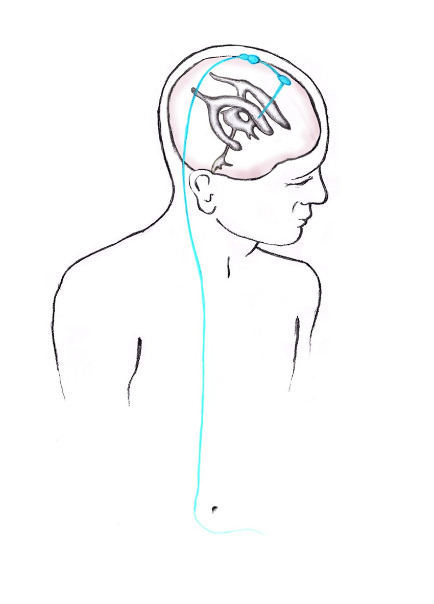 Schematisk översikt av shuntförloppet. VP-shunten utgörs av en ventrikelkateter som placeras i ena sidoventrikelns framhorn, vilken kopplas till en subgalealt placerad ventil som i sin tur är kopplad till en distal kateter. Den distala katetern tunneleras subkutant från skalpen till buken, där den förs in i fri bukhåla.
