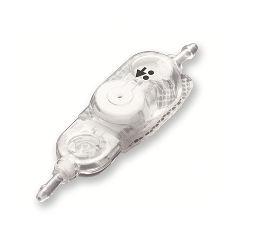 Shuntventilen kopplas till ventrikelkateter och distalkateter i flödesriktningen, som indikeras av pilen på shuntventilen. Denna modell har en likvorreservoar som kan punkteras för likvorprovtagning.