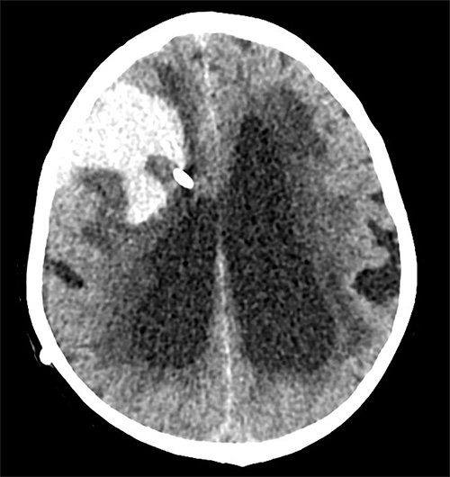 Axial DT-bild av patient som drabbades av en allvarlig blödningskomplikation frontalt höger utmed shuntslangens förlopp. Blödningen inträffade inom 48 timmar postoperativt.