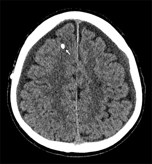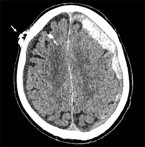 Axial DT-bild av en patient med bilaterala kroniska subduralhematom som uppstått till följd av överdränage. Den vita pricken frontalt höger (pil) utgörs av den röntgentäta intrakraniella katetern.