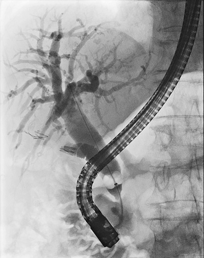 Endoskopisk retrograd kolangiopankreatografi (ERCP) på en patient som genomgått kolecystektomi. Bilden visar en omfattande