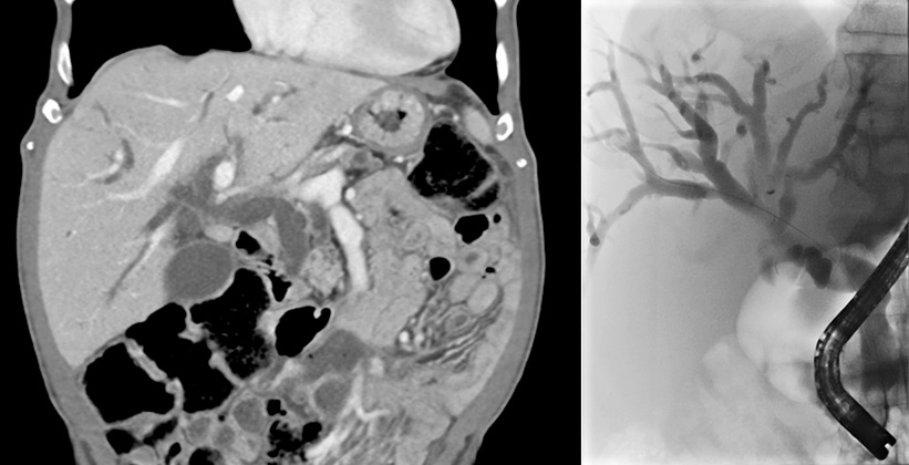 Datortomografi (t v) respektive endoskopisk retrograd kolangiopankreatografi (t h)av patient med tumör i papillområdet. Vida gallvägar observeras på båda bilderna.