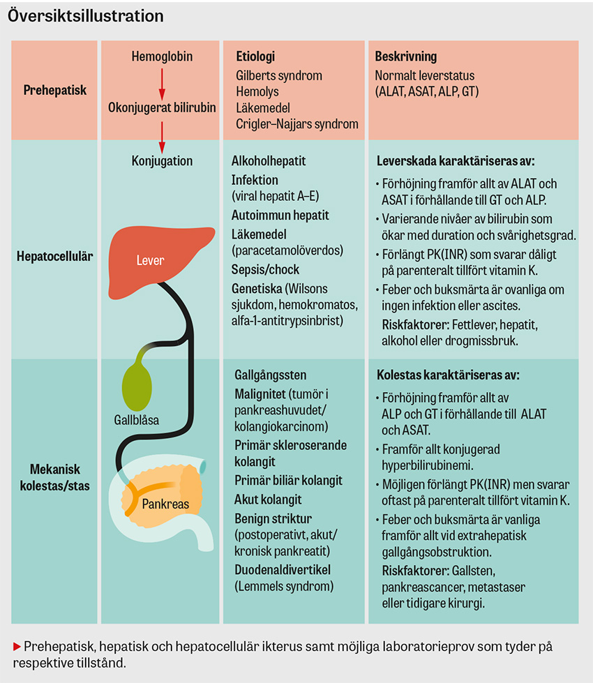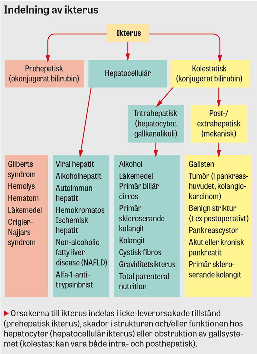 Med en noggrann anamnes, riktad statusundersökning och rutinblodprov kan man som regel differentiera mellan prehepatisk, hepatocellulär och kolestatisk ikterus i majoriteten av fallen [10, 12].