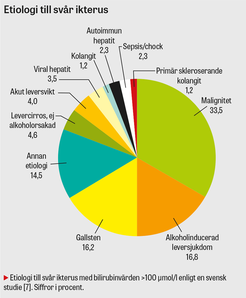 I en studie i Göteborg var den årliga incidensen av svår ikterus med bilirubinvärden ≥ 100 μmol/l 115 per 100 000 personer och år, med en medelålder på 59 år vid debut [7]. En retrospektiv studie från Wales [1] visade att uppemot en femtedel av ikteriska patienter i primärvården och på sjukhus initialt feldiagnostiserades eller var utan diagnos, samtidigt som både distriktsläkare och gastroenterologer överskattade prevalensen av viral hepatit. Observationsstudier visar att malignitet är bland de vanligare orsakerna till ikterus, framför allt hos patienter i övre medelåldern, och utgör en tredjedel av fallen [1, 7]. Denna statistik skiljer sig åt mellan olika studier [7-11]. I en svensk studie [7]var alkoholrelaterad leverskada och gallgångssten lika vanliga och utgjorde tillsammans cirka en tredjedel av fallen med ikterus. Viral hepatit (3 procent) och läkemedelsbiverkning (2 procent) var relativt ovanliga [7].