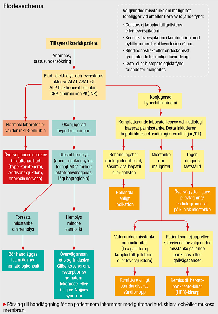 Akutmottagningen. Instabil patient bedöms initialt enligt ABCDE och vid behov i samråd med anestesijour. Akut leversvikt (förlängt PK(INR), encefalopati, cirkulationspåverkan), akut kolangit (feber, buksmärta, högt CRP och/eller leukocytos som kan uppvisa en septisk bild), akut-på-kronisk leversvikt, akut alkoholhepatit och Budd–Chiaris syndrom är samtliga allvarliga tillstånd som kräver snabb bedömning av erfaren kollega enligt respektive vårdprogram [27, 35-39]. Majoriteten av ikteriska patienter har dock ett relativt långsamt progredierande underliggande tillstånd, och akutläkaren fungerar som en facilitator i diagnostiken genom initiering av utredning och säkerställande av inläggning vid behov [40]. Patienter med misstänkt hepatocellulär eller kolestatisk ikterus bör inte släppas från akutmottagningen utan konsultation med medicinjour/gastroenterolog respektive kirurgjour/terapeutisk endoskopist [41]. Misstanke om hemolys bör föranleda skyndsam kontakt med hematolog [13].