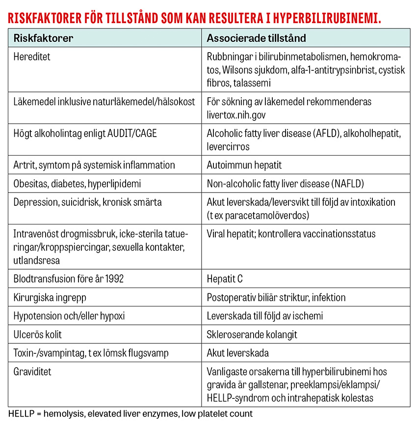 Okonjugerat bilirubin produceras från metabolismen av hem och transporteras därefter via plasman till levern för konjugering och slutligen utsöndring via gallvägar. Definitionsmässigt innebär ikterus gultonad hud, sklera och ibland mukösa membran till följd av en ökning av bilirubin i serum [2]. Denna kan bero på icke-leverorsakade tillstånd (prehepatisk ikterus), skador i strukturen och/eller funktionen hos hepatocyter (hepatocellulär ikterus) eller obstruktion av gallsystemet (kolestas, som kan vara både intra- och posthepatisk). Gultonad hud kan uppstå vid hyperkarotenemi, men då är sklera och bilirubinnivåer normala [3]. Ikterus kan ses vid nivåer av s-bilirubin kring 40 µmol/l; vid dessa nivåer ses ikterus initialt i skleran [4]. Typisk ikterisk hud ses först när S-bilirubin överstiger cirka 50 μmol/l [5]. Bilirubinstegring per se medför inte fara för vuxna, men kan för nyfödda vara neurotoxisk [6]. Neonatal ikterus kommer inte att diskuteras närmare i denna artikel.