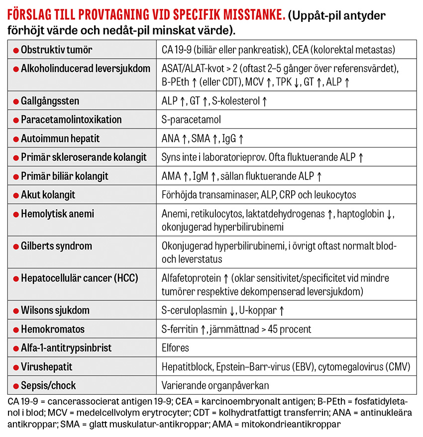 Första linjens provtagning innefattar blod-, elektrolyt- och leverstatus inklusive serumtransaminaser (ASAT, ALAT), gammaglutamyltansferas (GT), alkaliskt fosfatas (ALP), fraktionerat bilirubin, protrombinkomplex (PK(INR)), C-reaktivt protein (CRP) och albumin [13]. För utvärdering av leverfunktion är PK(INR) av största betydelse, men nedsatt leverfunktion kan förekomma vid både akut och kronisk leversjukdom [5]. Förbättring av PK(INR) med cirka ≥ 30 procent inom 24 timmar efter parenteral administrering av vitamin K indikerar att den syntetiska funktionen är intakt [20, 21]. ALAT är mer sensitivt och specifikt för leverskador, medan ASAT också ökar vid myokard- eller skelettmuskelskador. Hepatocellulär ikterus karaktäriseras av stegrade transaminaser i förhållande till GT och ALP; för kolestas gäller det omvända [5]. Vid ett normalt ALP är obstruktion osannolik [22]. Alkoholinducerad leversjukdom kan ibland uppvisa en ASAT/ALAT-kvot >2. Allvarligt förhöjda transaminaser (>30–100 µkat/l) tyder på paracetamolintoxikation, ischemi eller svår viral/autoimmun hepatit. Notera att ALAT- och ASAT-nivåer kan vara normala vid levercirros till följd av otillräcklig frisk levervävnad [5]. Fibros-4 (FIB-4)-poäng kan användas för screening av fibrosgrad. FIB-4 inkluderar ålder, ALAT, ASAT och trombocytnivåer i blodet [23].