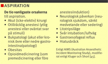 Aspiration uppkommer då maginnehåll dras ned i luftvägen förbi stämbandsplanet. Incidensen av aspiration i samband med anestesi för elektiv kirurgi är 1/2000–3000 och för akuta ingrepp 1/600–800 [1]. De vanligaste orsakerna till aspiration enligt Australian Anaesthetic Incident Monitoring Study (AIMS) sammanfattas i faktaruta.