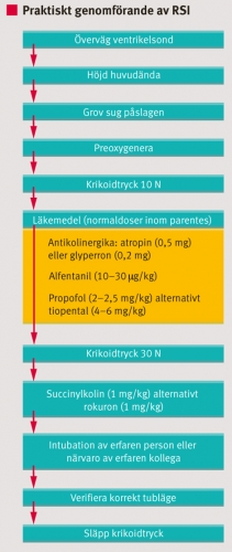 Förberedelse. Vid den preoperativa bedömningen bör man förvissa sig om att det inte finns tecken till svår intubation, vilket är en kontraindikation till RSI. I dessa fall bör man välja en annan lösning, tex fiberoptisk vakenintubation [4]. Inför sövning ska det finnas omedelbar tillgång till en funktionskontrollerad sug i händelse av regurgitation. Det ska också finnas en tänkt handlingsplan i händelse av svår intubation.