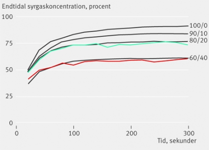 Preoxygenering ska ske med 100 procent syrgas, eftersom det finns ett direkt samband mellan inspiratorisk syrgashalt och hur länge patienten kan vara i apné utan att drabbas av hypoxi [12]. Det finns studier som visar att ren syrgasandning ger lungatelektaser, men den perioperativa betydelsen av denna atelektasbildning är ofullständigt utredd [16].